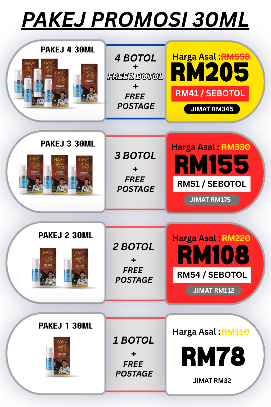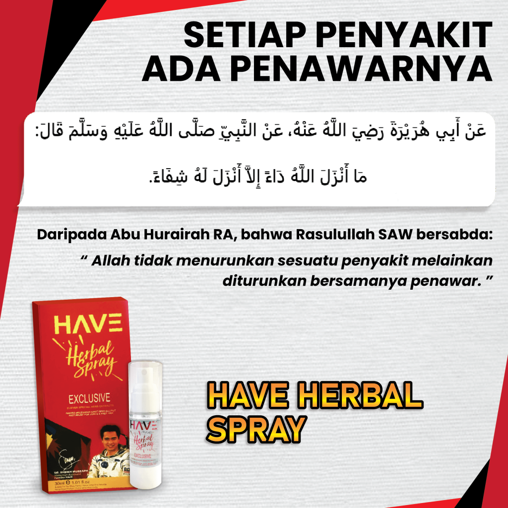 Sebotol HAVE Herbal Spray ni mengandungi 30ml dan boleh tahan 60 hari bergantung pada kekerapan penggunaan.
